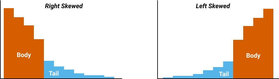 When the tail points to the left, it also points in the direction of negative numbers (on the x-axis, the numbers decrease from right to left). For this reason, a left-skewed distribution is sometimes also said to have a negative skew.