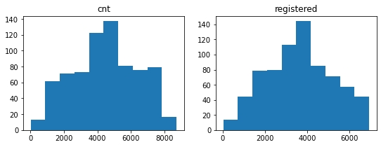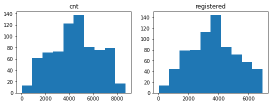 For instance, if we look at the histograms for the cnt and the registered columns, we can say they look similar to a normal distribution. This immediately tells us that most values lie in the middle, and the frequencies gradually decrease toward the extremities.