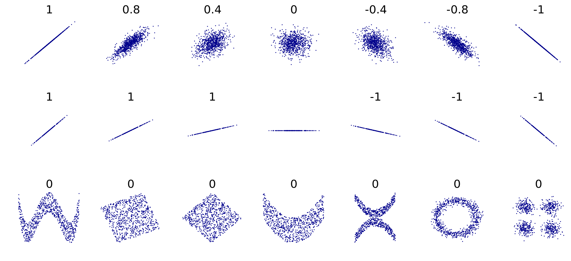 Below, we see various scatter plot shapes along with their corresponding Pearson's r.