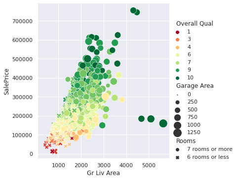 By default, Seaborn chose a circle and an "x" sign to represent the values in the Rooms variable. Recall that Rooms has two unique values: '7 rooms or more', and '6 rooms or less'.