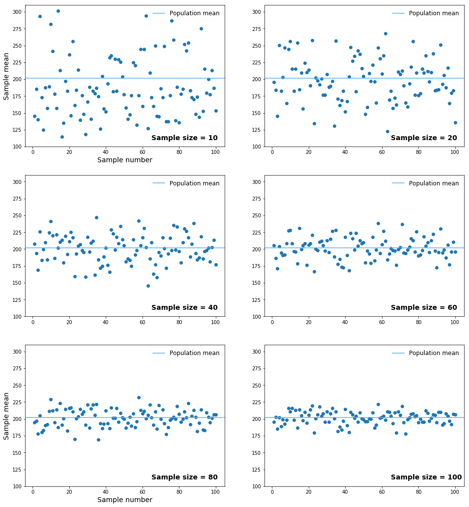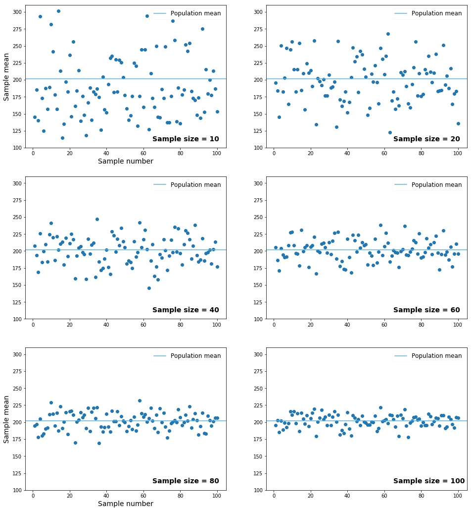 On the scatter plot from the previous screen, we can see that the sample means vary a lot around the population mean. With a minimum sample mean of 115 points, a maximum of 301.4, and a population mean of roughly 201.8, we can tell that the sampling error is quite large for some of the cases.